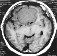 对于脑实质内的肿瘤是否用锁孔手术,万氏[5]认为不宜采用。在笔者所行的31例脑胶质瘤、海绵状血管瘤和转移瘤手术中,采用弧形皮肤切口和3.0cm×3.0cm的骨窗,完全切除这些部位肿瘤,包括脑室内直径12cm的室管膜瘤。体会到锁孔手术切除脑内深部肿瘤除了具有其手术优点外,由于切口小限制了对脑组织的牵拉,减轻了脑水肿,避免了常规开颅可能的去骨瓣减压。