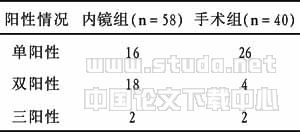 1.2 标本采集和细菌培养方法和药敏测试 内镜组:当插管成功以后,用不添加抗菌药物的造影剂证实导管在胆道内,本组均再将导管头部调整插至肝总管处后,用一次性的注射器回抽标本,立即注入培养皿送培养。手术组:明确有胆总管探查指征后,进腹以后解剖肝十二指肠韧带,暴露胆总管、肝总管,用一次性的注射器穿刺肝总管抽取胆汁,注入培养皿送培养。两组胆汁均采用美国Becton Dickinson公司BACTE-9050快速细菌培养仪及微生物自动检索系统和该公司原装进口的液体标本细菌培养皿和鉴定药敏组合板。