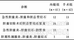 1.1 一般资料 本组把内镜治疗和手术探查的病例,根据心血管、神经系统、肺、肝、肾、胃肠道功能不全分级评出感染严重评分(SSS),再根据病情、体温及相关实验室检查结果做出感染评分(SS),然后将感染严重评分<30分、感染评分<10分作为入选条件[3],分为内镜组和手术组。内镜组61例,男29例,女32例,年龄65~87岁,平均年龄(67.5±2.419)岁。手术组62例,男30例,女32例,年龄63~83岁,平均年龄(66.5±2.506)岁。两组诊断情况见表1,表2。