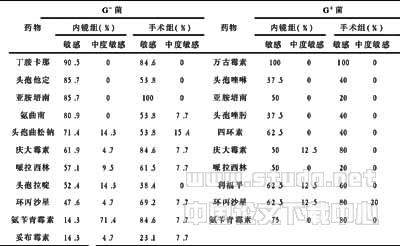 注:革兰阴性菌内镜组与手术组药物敏感对比P值为0.644。中度敏感对比P值为0.372。P>0.05;革兰阳性菌内镜组与手术组药物敏感对比P值为0.668。中度敏感对比P值为0.390。P>0.05。;亚胺培南P值<0.05;G-菌中丁胺卡那与庆大霉素药物敏感对比P值<0.05
