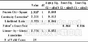 注:a:Computed only for a 2×2 table;b:1 cells(25.0%)have expected count less than 5.The minimum expected count is 4.48