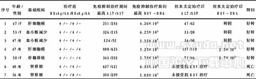 2.3 拉米夫定治疗HBV再激活病例 13例HBsAg携带者在进行包括糖皮质激素化疗或免疫抑制后7例出现病毒HBV-DNA高复制和肝功反复,其中5例在出现肝功反复后加用拉米夫定进行抗HBV治疗,在拉米夫定治疗1个月后,病毒载量下降或转阴,肝功恢复正常,另外2例肾移植患者未接受拉米夫定治疗,于HBV再激活后2周左右死于急性肝功能衰竭,见表4。