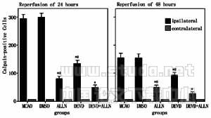 2.3 不同干预治疗后鼠脑中Calpain活性蛋白的表达 各组大鼠脑中Calpain活性蛋白的表达模式与其mRNA表达相似:MCA缺血2h再灌注24h及48h,各干预治疗组大鼠缺血侧脑中Calpain活性蛋白质的表达不同程度地增强(见图2),也以再灌注24h最为显著。溶剂DMSO对照组的表达量与MCAO组相似;各治疗组大鼠缺血对侧脑中未发现明显的Calpain蛋白活化;ALLN组缺血侧Calpain阳性细胞数明显减少;而DEVD组大鼠缺血侧脑组织中Calpain阳性细胞数的减少也很明显,再灌注后24h作用最强;DEVD+ALLN组缺血侧脑组织中Calpain的表达更进一步减少,分别与单用组相比,P<0.05;但各治疗组缺血侧脑中的Calpain表达仍高于对侧。