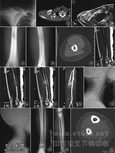 图1 右锁骨嗜酸性肉芽肿误诊为尤文肉瘤。X线平片(1a)显示外2/3呈蜂窝状膨胀性骨质破坏,边缘不规则,可见葱皮样骨膜增生;CT(1b)示病区骨皮质小钻孔样破坏,出现软组织肿块;MRI T2WI平扫(1c)示病变呈多房性不均匀高信号及袖套征。本例误诊为骨髓炎,主要是由于对骨嗜酸性肉芽肿的影像学表现缺乏认识或认识不足 图2 右肱骨中段嗜酸性肉芽肿误诊为尤文肉瘤。肱骨中段局限性溶骨性骨质破坏,骨皮质中断,病灶边界不清,少许平行状骨膜反应(2a、2b);CT(2c)显示病变区骨皮质小钻孔样破坏,内缘呈波浪状弧形压迹;T1WI(2d)病灶信号接近肌肉信号;T2WI(2e)病灶呈较高信号;增强扫描(2f)病灶明显强化,骨膜反应呈袖套征;MRA(2g)显示血供丰富 图3 C3嗜酸性肉芽肿漏诊及误诊为结核。C3椎体早期骨质破坏(3a),因未做CT及MRI而漏诊;C3椎体骨质破坏呈楔形,邻近椎间隙变窄(3b)。本例第1张X线平片漏诊,原因是未正确应用影像学检查手段,平片观察有限度,若进行MRI检查可做出早期正确诊断 图4 右腓骨下段嗜酸性肉芽肿误诊为尤文肉瘤。腓骨下段溶骨性骨质破坏,内缘呈波浪状压迹,周围见平行状骨膜反应(4a、4b);CT(4c)显示病变区骨皮质小钻孔样的穿破及层状骨膜反应