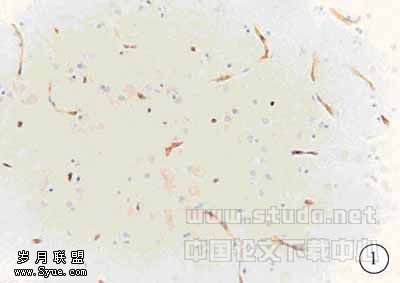 图1 对照组Glut-1(55kDa)免疫组化染色(SP法),显示清晰脑微血管内皮细胞边界,毛细血管形态完整、流畅,细胞膜及胞浆呈棕黄色染色10×20