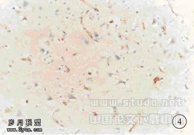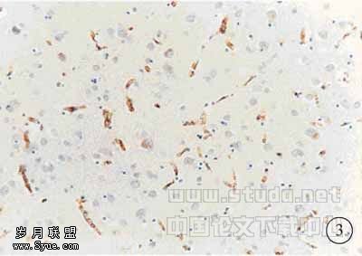 图4 HIH72h之后组的免疫组化染色(SP法加强型),脑组织广泛水肿,出血灶周围神经细胞及微血管内皮细胞水肿、坏死,可见点状出血。Glut-1在微血管内皮细胞(BBB破坏)的表达已经明显下降。星形细胞大量反应性增生、增殖、肿胀,Glut-1(45kDa)的表达水平达明显增强10×20