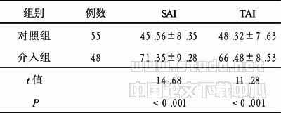 从表2可以看出,介入组的患者由于缺乏对动脉介入的了解,对此产生疑惑和怀疑、恐惧,心理压力大,使得介入组的SAI和TAI均分明显高于对照组,差异有非常显著性(P<0.001)。