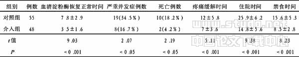 从表1可以看到,对照组有10例死亡,死亡率为18.2%,介入组有2例患者死亡,死亡率为4.2%,两者比较差异有显著性(P<0.05)。对照组和介入组发生严重并发症为34.5% vs 16.7%,血清淀粉酶正常时间比较为(7.8±2.9)天vs (3.5±1.6)天,可以明显看出采用不同的治疗途径,介入组比前者减少了严重并发症的发生,缩短了血清淀粉酶恢复正常时间,两者比较差异有显著性(P<0.05)。对照组和介入组的禁食时间为(15.6±5.3)天vs (8.5±2.8)天,住院时间为(25.9±6.2)天vs (14.8±5.6)天,介入组比对照组缩短了禁食时间和住院时间,两者比较差异有非常显著性(P<0.001)。疼痛时间明显缩短,(12±5.8)天vs (7±3.6)天,差异有非常显著性。