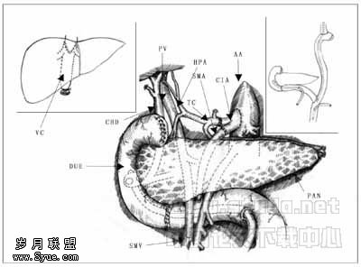 注:SMA:肠系膜上动脉;DUE:十二指肠;CBD:肝总管;SMV:肠系膜下静脉;PAN:胰;TC:腹腔干;PV:门静脉;AA:腹主动脉;VC:下腔静脉;CIA:髂总动脉