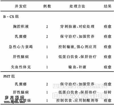 按Child-Pugh分级来评价重症B-CS的肝脏功能,大多为C级患者,如果套用PHT的治疗原则,大多数的重症B-CS患者将不能进行手术治疗。但研究显示,一组重症B-CS患者经支持治疗、保肝、纠正水电解质失衡以及腹水的浓缩回输等措施后,一般都能耐受手术,且术后肝功能恢复和远期效果优于PHT,术后死亡率为4.76%[5],与文献报道B-CS术后死亡率相近[7]。本研究中,12例重症B-CS患者均安全渡过围手术期,B-CS组和PHT组手术并发症发生率之间差异无显著性(P>0.05)。