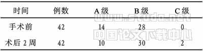 表2 B-CS组手术前、术后2周肝功能(Child-Pugh分级)变化情况 (例)