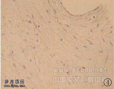 图4 置入6个月后,闭合器内芯周围包绕的主要为增生的纤维结缔组织