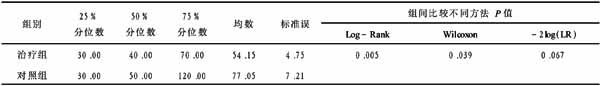 由表6可见两组首次用药起效时间的中位数,分别是治疗组40.00min、对照组50.00min,两组首次用药起效时间的平均数,分别是治疗组54.15min、对照组77.05min,经生存分析比较,两组的首次用药起效时间差别有统计学意义。