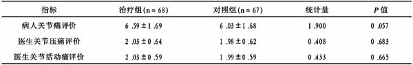 1.3.2 疗效评价标准 疗效的评价指标包括:主要指标:患者对关节痛的评价(VAS值)改善程度公式:[(治疗前VAS值-治疗后VAS值)/治疗前VAS值]×100%;次要指标:关节压痛程度和关节活动痛程度[每改变1级按照改变33%计算]。综合疗效评定标准为:主要指标改善≤20%,或主要指标改善≥20%但两项次要指标改善均≤33%为无效;主要指标改善在20%~50%之间,同时有一项次要指标改善≥33%为有效;主要指标改善>50%,或主要指标改善>20%、同时两项次要指标改善均≥33%为显效。