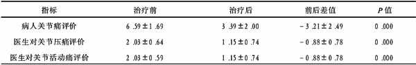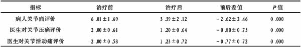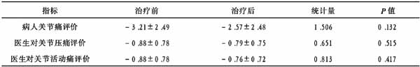 2.2 疗效评价 两组患者治疗后病人关节痛评价评分、医生对关节压痛评价评分、医生对关节活动痛评价评分与治疗前相比,均有明显降低,治疗前后自身对照比较,均有明显统计学意义,P<0.01,见表2、表3。