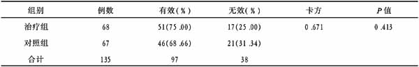 由表5可见,两组综合疗效比较,治疗组有效率为75?00%,对照组有效率为68.66%,经统计学检验,两组差异无显著性。