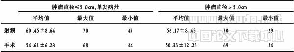 对于直径>5.0cm的肿瘤或多发性的肿瘤,肝功能损伤射频治疗组较手术治疗组轻,差异有显著性。AFP水平变化两组之间无明显差异。并发症射频治疗组明显少于手术治疗组。影像学资料显示,手术组为肝脏手术后改变,而射频治疗组治疗后即时B超则未见明显变化,后期随访影像学资料则显示肿瘤有部分坏死,尚有部分病例出现新发病灶。需要说明的是,在临床工作中,对于可能行手术治疗(包括姑息性手术治疗)的肝癌患者,我们首选手术治疗而非其他治疗手段,因此,在这一组中,患者的病情分布存在差异;手术治疗组患者的肿瘤直径平均约为6cm,而接受射频治疗组患者的肿瘤直径平均为9cm;54例接受手术治疗的患者中,有1例为Child-Pugh B级,占1.9%,61例接受射频治疗的患者中有7例为Child-Pugh B级,占11.5%,差异有显著性。显然,射频治疗组的患者的癌症分期明显晚于手术治疗组。因此,对于该组病情分布不均衡的患者进行生存率和一年生存时间的分析比较是没有意义的;但是,我们的研究证明即使是在患者病情分布并不均衡,接受射频治疗的患者肝脏肿瘤分期以及肝脏功能等指标均差于接受手术治疗的患者的情况下,射频治疗较手术治疗仍然获得了较轻的肝脏功能损害,较低的并发症发生率和住院花费,较短的住院时间以及较高的术后生存质量。