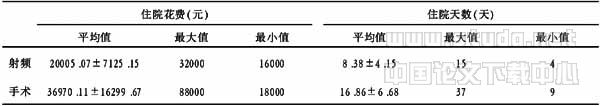 住院治疗花费射频治疗组少于手术治疗组(P<0?05);住院天数射频组少于手术治疗组(P<0.05)。
