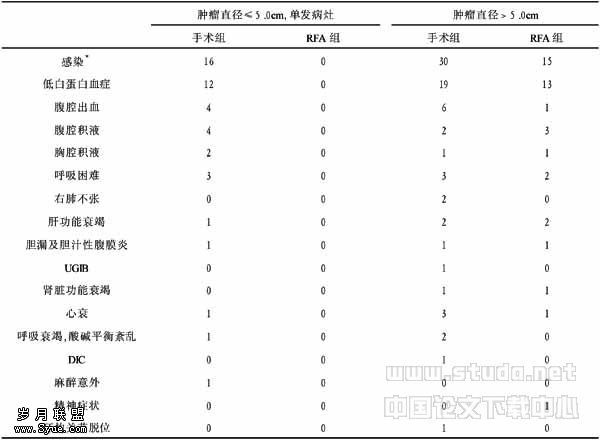 两组患者中,接受射频治疗患者的并发症发生率分别为13.3%(肿瘤直径≤4.0cm,单发病灶)和34.4%(肿瘤直径>4cm)均低于接受手术治疗患者的并发症发生率79.3%(肿瘤直径≤4.0cm,单发病灶)和77.8%(肿瘤直径>4cm),P<0.001。