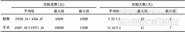 住院治疗花费射频治疗组少于手术治疗组(P<0?001);住院天数射频组少于手术治疗组(P<0.001)。