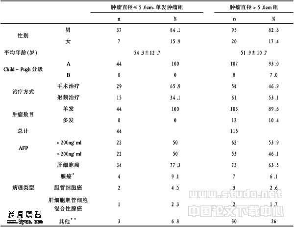 1.1 一般资料 从2003年2月~2004年11月,四川大学华西普外科收治的肝癌患者159例,根据肿瘤直径大小以及是否单发病灶将患者分为两组:肿瘤直径≤5.0cm、单发肿瘤组44例,接受手术治疗29例,接受射频治疗15例;直径>5.0cm组115例,接受手术治疗54例,接受射频治疗61例。患者一般资料见表1。诊断依据为:B型超声、CT及肝癌标志物——甲胎蛋白(AFP)水平,手术组术后病理诊断结果,冷循环射频组肝穿刺活检结果。