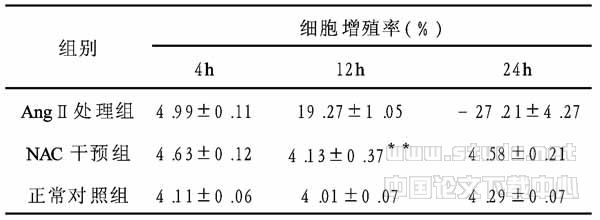 2.2 NAC对AngⅡ诱导ECV304细胞增殖的抑制作用 与AngⅡ处理组相比细胞增殖率差异有显著性(P<0.01),10mmol/L NAC可抑制1μmol/L AngⅡ对ECV304细胞的增殖作用,而与正常对照组相比差异无显著性(P>0.05),见表2。