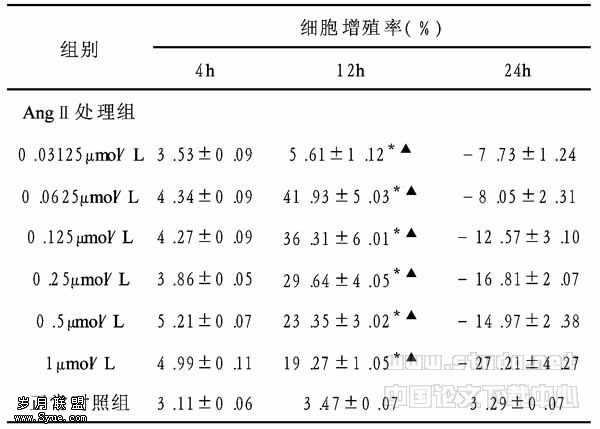 2.1 AngⅡ对ECV304细胞增殖作用的影响 不同浓度的AngⅡ作用ECV304细胞4h时,细胞增殖不明显,与正常对照组相比差异无显著性(P>0.05);作用时间为12h时,不同浓度AngⅡ(0.03125~1μmol/L)均可促细胞增殖,与正常对照组相比差异有显著性(P<0.05),0.0625μmol/L AngⅡ促细胞增殖率达到最大,随AngⅡ浓度的增大,细胞增殖率反而逐渐减小;作用时间为24h时,细胞呈负增殖,随AngⅡ浓度的增大,增殖率逐渐降低。AngⅡ作用细胞12h时,与相同浓度组作用时间4h相比,细胞增殖率差异有显著性(P<0.05),见表1。