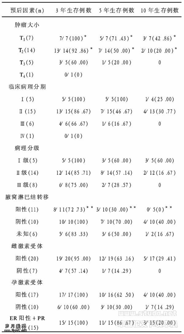 2.2 影响预后因素分析 腋窝淋巴结转移与否、肿瘤大小、组织学分级、激素受体阳性与否以及临床病理分期与3年、5年及10年的中长期生存率关系见表1。