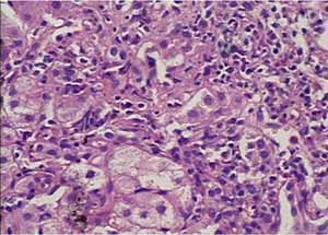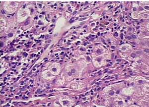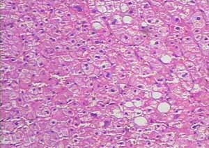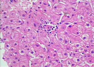 治疗52周,第2次肝检,病理诊断(20050968):CHB,G1 S0。个别肝细胞胞浆内见有脂滴。提示:经52周治疗肝脏组织学病变明显改善。见图2、3。