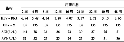 注:表中的数字HBV-DNA Log10,HBV-M指(HBsAg HBsAb HBeAg HbeAb HBcAb)