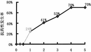 图1 拉米夫定治疗的抗药性逐年发生率 图1显示:Lamivudine治疗1年抗药性为24%,4年达70%。