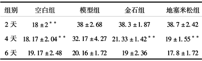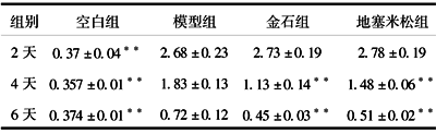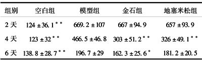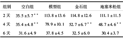 2.1.2 血清丙氨酸氨基转移酶(ALT) S-D大鼠经ANIT染毒后2天,ALT迅速升高,是空白组的5.39倍(P<0.01),4天后,ALT已开始下降但仍是空白组的3.77倍(P<0.01),而金石散、地塞米松治疗组ALT下降更加迅速,与模型组比较差异有显著性(P<0.01),6天后,模型组与地塞米松组差异已无显著性,而模型组与空白组差异有显著性(P<0.01),模型组与金石散组差异仍有显著性(P<0.01),但有所接近。见表1。