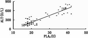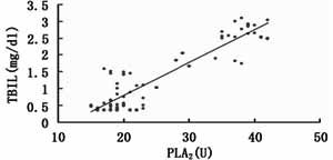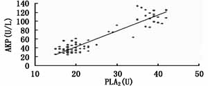2.3 大鼠血清生化指标与肝组织PLA2关系 血清ALT、AKP、TBIL与肝组织匀浆PLA2呈正相关,相关系数分别为 γALT=0.61,γAKP =0.577,γTBIL=0.593 结果见图1~3。