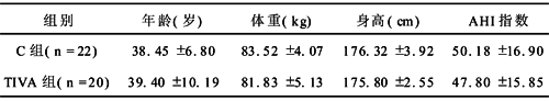 1.1 一般资料 选择42例择期行UPPP术的OSAS男性患者,年龄18~60岁,ASAⅠ~Ⅱ级。体重指数(体重/身高2)≤30。排除标准为:有明显肝、肾损害,不可控制的高血压及精神疾患的患者;有酒精、阿片类药物、苯二氮卓艹类药物依赖的患者;对阿片类、异氟醚、异丙酚有过敏史的患者。手术前均获得患者的知情同意权。