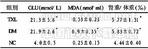 表1 各组大鼠血糖、肾体重比及MDA情况 (x±s)