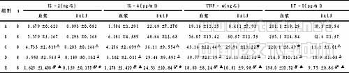 1.6.2 血浆及BALF中TNF-α、IL-2、IL-4的含量测定 取抗凝血以3000r/min离心5min,取血浆待用。采用ELISA法测血浆及BALF中TNF-α、IL-2、IL-4的含量。(具体步骤按试剂说明进行操作)。