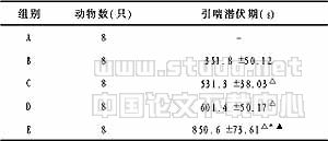 2.1 平喘合剂对哮喘模型大鼠引喘潜伏期的影响 正常大鼠引喘不敏感,没有明显的喘息表现,仅有短暂的呼吸增快,很快恢复正常。引喘时出现,说明造模成功。引喘时出现四肢挠抓,躁动不安,伴有呼吸加速,腹部内陷起伏等呼吸困难症状时,作为哮喘模型大鼠的引喘潜伏期。见表1。
