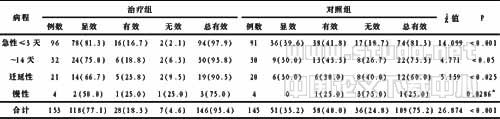 1.3 疗效判断标准[2] 显效:急性用药72h内,迁延性、慢性用药5天内粪便性状及次数恢复正常,全身症状消失;有效:急性用药72h时,迁延性、慢性用药5天时粪便性状及次数明显好转,全身症状明显改善;无效:急性用药72h时,迁延性、慢性用药5天时粪便性状、次数及全身症状均无好转,甚至恶化。