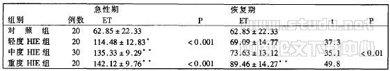 各组ET治疗前后比较见表1。中一重度HIE组急性期血浆内皮素明显高于轻度组··,中一重度组急性期与恢复期比较各组P<0.001,七值35.1、49.8轻度HIE组ET高于对照组P<0.001,对照组值仍高于内地报道的对照组。各组HIE急性期与恢复期血浆ET呈显著差异··P<0.01。