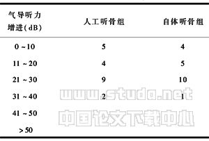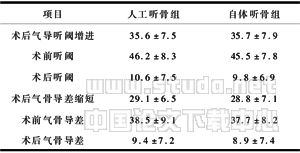 人工听骨组术后气导听阈增进(35.6±7.5)dB,与自体听骨组术后气导听阈增进(35.7±7.9)dB比较,P>0.05,对比组之间的差异无显著性。