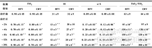 1.2 方法 30例患儿均于入院2h内明确诊断后即上机治疗,均先用CMV治疗,预调指标:FiO2 0.65,PIP 18~22cmH2O,PEEP 2~3cmH2O,呼吸频率RR 25~30次/min,通过调节各项参数以维持PaO2在55~90mmHg,SaO2在0.90~0.95,PaCO2在35~55mmHg。当FiO2用至≥0.80,SaO2仍不能稳定在0.90以上者,上机4h后改用HFV治疗。具体方法如下:启动HFV,频率调至10~13Hz,振幅置于零位,保持CMV时的FiO2不变,将CMV的RR减至10次/min,PIP降低2~3cmH2O,流量由原来的8L/min改为10L/min,提高PEEP使MAP接近或等于CMV时的MAP;增加振幅,以看到患儿胸廓有较明显振动为度。根据血气分析结果调整振幅和MAP,使SaO2达0.90~0.95,PaO2 55~90mmHg,PaCO2 35~55mmHg。HFV的频率基本保持不变,待FiO2降至0.60以下,MAP降至6.5cmH2O,振幅10~15cmH2O,改为IMV,直到撤机。30例患儿在应用呼吸机治疗过程中,持续监测心率、呼吸、血压、脉搏、SaO2。血气分析开始时每2h 1次,病情稳定后4~8h 1次,以后逐渐减少,但每天不少于2次,直至撤机。X线胸片每日1次。治疗过程中做如下指标记录:FiO2、MAP、PIP、OI(OI=FiO2×100×MAP/PaO2)、a/A(a/A=PaO2/PAO2)、PaCO2、PaO2/FiO2值。