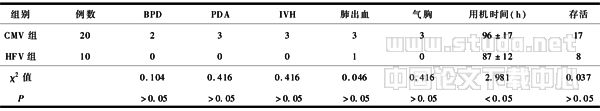 2.2 并发症及转归 30例患儿中3例发生气胸,均治愈;CMV组有2例发生支气管肺发育不良;30例患儿做头颅B超检查,3例发生脑室内出血(IVH),均发生在CMV治疗组,CMV组成活17例,HFV组成活8例;死亡者中,脑室内出血3例,均发生在CMV治疗组,1例ALI并发NEC肠穿孔9天死亡,1例重度窒息患儿因合并肺炎克雷伯菌败血症治疗11天死亡。10例用HFV治疗及20例用CMV治疗,患儿的呼吸机应用时间和吸氧时间差异均有显著性。见表2。