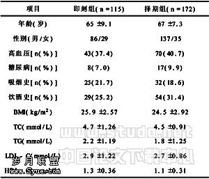 摘要】 目的 比较冠状动脉造影后即刻支架术与择期支架术的成功率和并发症发生率,从而探讨即刻支架术的临床应用价值。方法 对2005年1~12月在我科行冠状动脉造影后即刻支架术(即刻组,n=115例)和择期支架术(择期组,n=172例)患者的资料进行分析。结果 A型和B型病变的成功率和并发症率两组间差异无统计学意义(P>0.05),而C型病变的成功率即刻组低于择期组(P<0.01),而并发症率高于择期组(P=0.05)。结论 A型和B型病变冠状动脉造影后即刻支架术是临床可行的,而C型病变不宜冠状动脉造影后即刻支架术。因此,冠状动脉造影后即刻支架术有一定的临床应用价值。 【关键词】 冠状动脉造影;经皮冠脉介入;经皮冠状动脉腔内成形术;支架 Clinical study of immediate stenting and elective stenting after coronary angiography 【Abstract】 Objective To compare the success rate and complication rate of stenting immediately and selective stenting after coronary angiography,and to estimate the clinical evaluation of stenting immediately.Methods 115 patients who underwent stenting immediately after coronary angiography were enrolled in immediate group(group 1),and 172 patients on whom stenting and coronary angiography were performed in two different selective days were enrolled in selective group(group 2) in our catheter room during 2005.The clinical manifestations,target lesion characteristics and length and diameter of stent of two groups were similar.Results The success rates and complication rate types A and B lesions were not significantly different between two groups(P>0.05).The success rate of type C lesions in group 1 was lower than that in group 2(62.5% vs 86.0%,P=0.007).The complication rate of type C lesions in group 1 was higher than that in group 2(35.0% vs 17.5%,P=0.05).Conclusions Types A and B lesions were receivable to be performed stenting immediately and type C lesions were suitable to be performed it immediately after coronary angiography.So stenting immediately after coronary angiography has some extent of clinical evaluation. 随着冠心病的发病率越来越高和经皮冠脉介入治疗(PCI)的推广应用,PCI已成为治疗冠心病的一个重要措施。本研究比较了即刻支架术与择期支架术成功率和并发症的发生率,为临床选择支架术的时机提供依据。现对2005年1~12月在我科行冠状动脉造影后即刻支架术(即刻组)和择期支架术(择期组)患者的临床资料分析如下。 1 资料与方法 1.1 一般资料 所有患者按Judkins法行冠状动脉造影后,立即行支架术的患者入即刻组,不立即行支架术的患者入择期组,两组患者的一般资料特征见表1。 即刻组的病变血管情况:冠状动脉造影显示单支、双支、三支血管病变分别为69、24、22例,置入一个支架者100例,置入2个或2个以上支架者15例,共131支血管置入支架,其中前降支(LAD)67支共82枚、回旋支(LCX)20支共31枚、右冠状动脉(RCA)44支共57枚,共置入支架170 表1 两组患者的一般资料 (x±s)