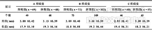 注:均P>0.05,A型、B型和C型病变两组之间支架特征差异无显著性 1.2 术前准备 即刻组术前口服阿司匹林300mg和氯吡格雷300mg,择期组术前至少口服3天或3天以上的阿司匹林100mg,qd和氯吡格雷75mg,qd。 1.3 支架术成功的标准 术后支架贴壁良好,残余狭窄≤20%,无夹层、急性闭塞和血栓形成,无死亡,无急性心肌梗死或紧急CABG的并发症发生。 1.4 并发症判定 冠状动脉急性闭塞、分支闭塞、冠状动脉内急性血栓形成、严重的冠状动脉痉挛、冠状动脉穿孔、死亡和夹层形成。 1.5 统计学方法 所有资料均用SPSS 11.5进行统计学分析,计量资料用t检验,计数资料用χ2检验,理论数小于5用Fisher精确概率法,检验水准为α=0.05。 2 结果 2.1 病例成功率 即刻组成功105例,病例成功率为91.3%,失败的10例均因并发症所致。择期组成功166例,病例成功率为96.5%,失败的6例均因指引导丝、球囊或支架未能通过病变处所致。两组成功率比较,P>0.05,差异无显著性,提示两组之间支架术的病例成功率是没有差别的。 2.2 不同血管的成功率 即刻组与择期组LAD的成功率分别为94.0%(63/67)和99.0%(95/96),LCX的成功率分别为90.0%(18/20)和92.3%(24/26),RCA的成功率分别为86.4%(38/44)和92.5%(62/67),两组间比较,均P>0.05,差异无显著性,表明两组之间不同血管支架术的成功率是没有差别的。 2.3 不同类型病变的成功率 即刻组与择期组A型病变的成功率均为100%,B型病变的成功率分别为94.4%(68/72)和95.1%(97/102),均P>0.05,差异无显著性,表明两组之间A型和B型病变支架术的成功率是没有差别的。而C型病变的成功率分别为62.5%(25/40)和86.0%(49/57),两组比较P=0.007,差异有统计学意义,表明两组之间C型病变支架术的成功率是有差别的,即刻组支架术的成功率低于择期组。 2.4 并发症的发生率 即刻组与择期组A型病变的并发症率均为0,B型病变的并发症发生率分别为5.6%(4/72)和6.9%(7/102),均P>0.05,表明两组之间A型和B型病变支架术的并发症率是没有差别的。而C型病变的并发症发生率分别为35.0%(14/40)和17.5%(10/57),P=0.05,差异有统计学意义,表明两组之间C型病变支架术的并发症发生率是有差别的,即刻组支架术的并发症率高于择期组。其中即刻组发生非致死性心肌梗死5例,死亡2例。 2.5 闭塞性病变支架术成功率与并发症发生率 即刻组闭塞性病变支架术的成功率为76.0%(19/25),并发症发生率为24.0%(6/25),择期组闭塞性病变成功率为79.4%(27/34),并发症发生率为20.6%(7/34),P>0.05,即两组之间差异无统计学意义。而在行择期支架术时择期组有3例患者由次全闭塞为完全闭塞。 3 讨论 目前PCI已成为治疗冠心病的一个重要手段,但是行PCI的时机选择一直是冠心病介入治疗讨论的热点问题。大量的临床试验显示冠状动脉内支架术明显优于经皮冠状动脉腔内成形术(PTCA)[1,2],尤其是药物洗脱支架的发明开创了冠脉介入治疗的新纪元,随着经验的积累和成熟,器械的改进和完善以及新技术的出现,迈向“无再狭窄”的时代并没有不可能,RAVEL[3]试验显示西罗莫司药物洗脱支架组的6个月再狭窄率为0%。1988年ACC/AHA指南[4]建议将PTCA与冠脉造影分开进行,使术者有足够的时间进行术前准备和分析患者冠脉病变的特征,并强化抗血小板治疗。同时,择期PTCA对高龄及肾功能不全的患者可减少造影剂肾损害的发生机会。ATT(antithrombotic trialist collaberation)荟萃研究发现抗血小板治疗可使冠脉成形术患者心血管事件减少53%,而PCI术心血管事件主要是血小板依赖性的[5],因此围手术期抗血小板治疗已成为提高疗效和降低并发症的重要手段[6]。目前常用的抗血小板聚集的药物有阿司匹林和ADP受体拮抗剂,但由于阿司匹林的代谢和血小板的更新速度存在个体差异等因素,在某些患者常规剂量阿司匹林难以立即发挥抗血小板聚集的作用;而ADP受体拮抗剂的抗血小板聚集作用亦受到服药时间的限制,CREDO研究亚组分析显示在PCI术前6~24h口服氯吡格雷,1个月终点事件发生率与安慰剂组相比减少38.6%(P=0.051);而在PCI术前6h口服,1个月终点事件发生率与安慰剂组差异无统计学意义[7]。因此冠脉造影后即刻支架术的临床应用价值受到一定程度的限制。但择期支架术也增加了患者和家属的负担及不便,延长了住院时间。20世纪90年代以来国外多个临床试验报道即刻经皮冠状动脉腔内成形术(PTCA)和择期PTCA的成功率、并发症发生率和死亡率是相似的,而即刻PTCA的住院时间、总住院费用、手术时间、透视时间及造影剂用量均比择期PTCA少,因此即刻PTCA具有一定的临床可行性和优越性[8,9]。 目前尚无即刻支架术与择期支架术二者成功率和并发症发生率的比较。本研究显示A型和B型病变冠脉造影后即刻支架术和择期支架术的成功率和并发症发生率是相似的,但对于C型病变即刻组的成功率低、并发症发生率高,可能与C型病变形态复杂、支架术术前必须仔细分析病变的特征、需要各种介入器械、较高的介入技术和较好的导管室条件有关。因此,A型和B型病变冠脉造影后即刻支架术是可行的,具有一定的临床应用价值,但对于C型病变一般不宜行即刻支架术,充分的术前准备可以提高支架术的成功率和减少并发症。两组的闭塞性病变支架术的成功率和并发症发生率是相似的,但择期支架术时次全闭塞性病变有可能进展为完全闭塞性病变而增加介入治疗的难度和患者的死亡率,因此冠脉造影发现次全闭塞或闭塞性病变时,可试行即刻支架术。 