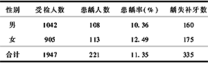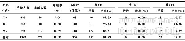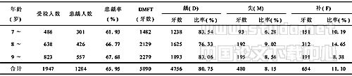【摘要】 目的 掌握无锡市1~3年级小学生口腔健康状况和现状,探讨预防和治疗小学生龋齿的有效措施。方法 采用WHO口腔健康调查方法抽样调查,并对调查结果进行统计分析。结果 1~3年级小学生乳牙总患龋率为65.59%,乳牙龋的总体充填率为11.10%;恒牙总患龋率为11.35%,恒牙龋总体充填率为18.51%;牙龈出血和牙结石的患病率分别是46.53%和12.28%。恒牙龋、牙龈出血及牙结石的患病率均随年龄的增加而升高(P<0.005)。结论 应进一步研究以小学生口腔健康为主的口腔疾病综合防治策略,加强对小学生的口腔卫生指导,积极预防和早期治疗小学生的口腔疾病。 【关键词】 口腔健康;健康教育;龋齿;小学生 Mouth health investigation of 1 to 3 grade school in Wuxi and discuss on policy of its prevention and cure 【Abstract】 Objective To predominate status of mouth health and cure in one to three grade school and discuss the policy of its efficacious.Methods Be used WHO mouth health sample investigate means.The data was analyzed by statistics.Results The rate of decayed primary tooth was 65.59%.The padded rate of decayed primarytooth was 11.10%.The rate of decayed permanent tooth was 11.35%.The padded rate of decayed permanent tooth was 18.51%.The rate of gum bleeding was 46.53%.The rate of concretion tooth was 12.28%.The rate of decayed permanent tooth,gum bleeding and concretion tooth increased with grade.(P<0.005).Conclusion We need to more study synthesis policy of prevention and cure for pupil mouth disease and give priority to study mouth health education.It is needed with forepart cure the disease. 【Key words】 mouth health;health education;decayed tooth;pupil 龋病是小学生的常见病,也是小学生口腔保健最主要的内容。为了解无锡市小学生的口腔健康状况,建立口腔健康教育和龋病防治的调查基线,我们于2004年3月对无锡市1947名1~3年级小学生进行了口腔健康调查,现报告如下。 1 对象与方法 1.1 调查对象 无锡市2所小学1~3年级小学生共1947人,年龄7~10岁,其中男1042人,女905人,分为7岁~、8岁~、9岁~3个年龄组。 1.2 调查方法 检查标准采用WHO推荐的口腔健康调查方法[1]及全国第二次口腔流行病学调查方法[2]进行,使用统一设计的表格,调查人员为4名接受过口腔健康调查培训的口腔医师。在调查之前和调查之中进行标准一致性试验,Kappa值均大于0.8,可靠度为优。 检查在学校现场光线下进行,使用统一的调查器械,对受试者进行口腔检查,并做相应记录。每个受检者大约花费5min,并对其中10%的受检小学生进行复查以确定检查的可靠性。 1.3 统计学方法 调查资料采用SPSS 10.0统计软件进行数据分析,结果用百分率描述,比较采用χ2检验。 2 结果 2.1 乳牙患龋情况 2.1.1 年龄分布及龋、失、补构成情况 乳牙的患龋率随着年龄的增长而升高,乳牙龋总体充填率仅为11.10%,但差异无显著性(P>0.05);龋牙率8岁组明显低于7岁组和9岁组,失牙率7岁组明显低于8岁组和9岁组,补牙率9岁组明显低于7岁组和8岁组,龋牙率、补牙率经统计学检验差异均有非常显著性(P<0.01),见表1。