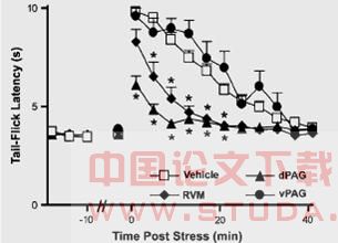 表 3.在非阿片性应激性镇痛中dPAG起到重要作用。与vPAG、RVM和对照组相比在dPAG 显微注射利莫那班 (2nmol) 可以对应激性镇痛产生最大程度的抑制 (F 3,484 = 96.42, P < .0001)。 采用双盲法用电击(0.9 mA,3 分钟) 后甩尾潜伏期评估SIA 。dPAG指背外侧PAG; RVM,延脑头端腹内侧; SIA,应激性镇痛; vPAG,腹外侧PAG。