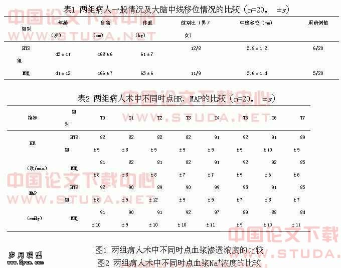 两组均产生扩容和血液稀释作用,继之产生的隔绝血管内水的作用即使很短暂,但明显减少了潜在性的水肿状态,为神经外科手术提供了良好的操作环境。据报道【11】的快速输注高渗液体后可能出现的短暂低血压在我们的研究中也未观察到。