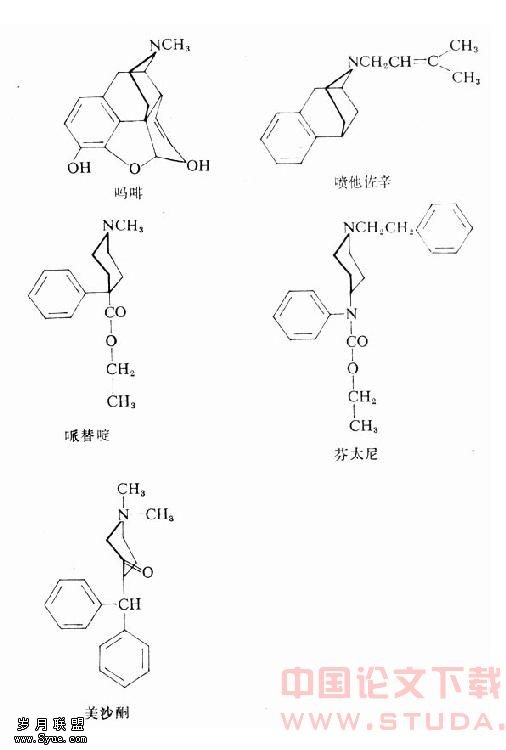 吗啡易成瘾,是其严重缺点。为了寻找更好的代用品,合成了哌替啶、安那度、芬太尼、美沙酮、喷他佐辛、二氢埃托啡等药,它们的成瘾性均较吗啡轻。较常用的几个药物的化学结构见图18-3