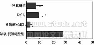 如图2所示,GdCl3抑制了KC细胞活性后,肝脏缺氧-复氧损伤程度明显下降,可见肝脏缺氧-复氧早期损伤中KC的重要作用。而2MAC异氟醚发挥了类似作用,所以我们认为异氟醚的保护作用可能与抑制KC活性有关。近来的研究发现:蛋白激酶C(PKC)的活性能被吸入麻醉药抑制[5],而PKC-NADPH氧化酶途径是KC产生细胞外O2-的关键途径[6,7],所以异氟醚可能通过抑制KC中PKC介导的信号途径来减少O2-产生,抑制肝脏复氧损伤,更直接的证据有待在进一步研究中得到。