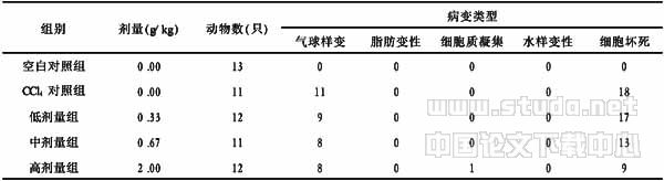 2.2 灵芝孢子油对受试动物肝脏病理变化的影响 CCl4对照组和灵芝孢子油各剂量组动物的肝脏病理改变以肝细胞坏死和气球样变为主,病变部位主要在肝小叶中央静脉周围。CCl4对照组与空白对照组比较,有明显的肝脏损伤,经统计学检验,差异有非常显著性(P<0.01),表明CCl4肝损伤模型成立,见表2。灵芝孢子油各剂量组肝细胞坏死评分与CCl4对照组比较,差异有非常显著性(P<0.01);其它病变类型各剂量组与CCl4对照组比较,差异无显著性(P>0.05)。结果表明:实验动物肝脏病理结果阳性,见表3。